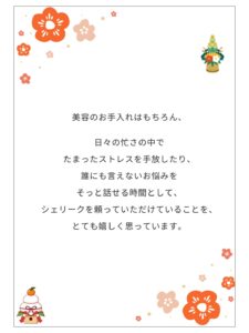 HOME > Blog > Blog サロンのこと2026年 あけましておめでとうございます🎍 投稿日:2026年1月5日 2026年 あけましておめでとうございます🎍 本日1月5日から通常営業しております2026年もシェリークをよろしくお願い致します ☆Shereek(シェリーク)女性専用エステサロン大阪市平野区平野西5丁目7-9ジョリヴェルジュ1階 東京店はこちらホットペッパービューティー各種SNS 06-7410-4661駐車場案内はこちら LINE ID→shereekshereek お友達追加後、メッセージをお送りくださいませ -Blog, サロンのこと